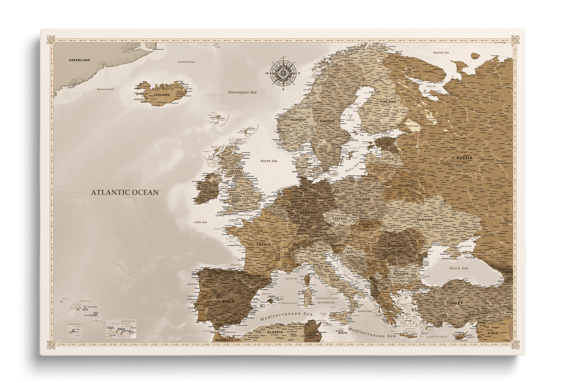 Personalised travel europe map pinboard printed on canvas with push pins. Functional map for marking places you've been or places to go. Practical decoration as vintage wall art in shades of brown and beige.