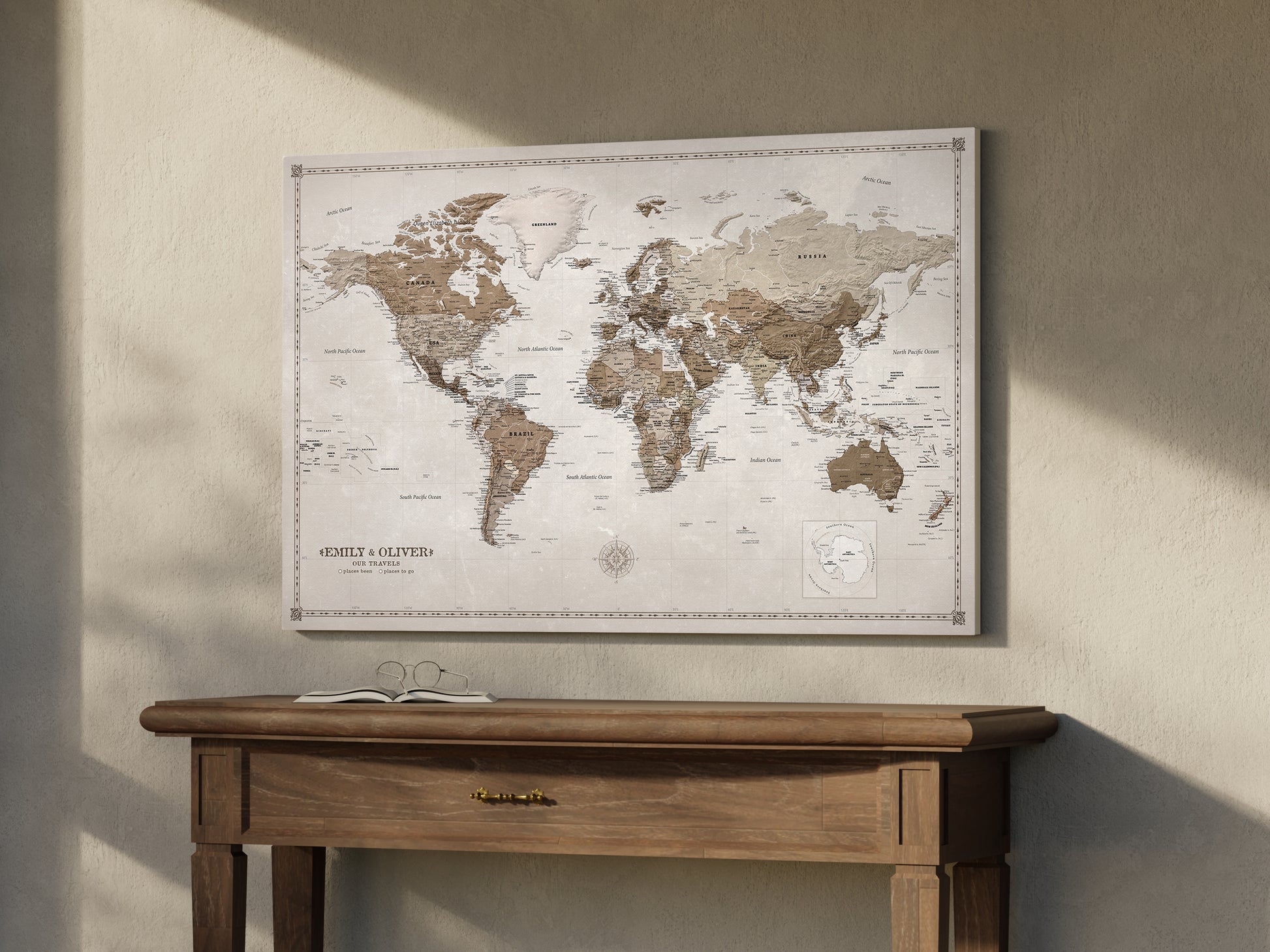Personalised travel world map pinboard printed on canvas with push pins. Functional map for marking places you've been or places to go. Practical decoration as wall art in shades of beige and brown.